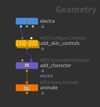 Skin controls are set up using the APEX Configure Controls SOP. In the animation workflow, place the APEX Configure Controls SOP after the character with a rig, and before the