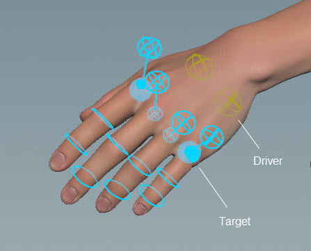 The following FK controls are added to the fingers. The selection handle selects all the FK joints for the finger so you can easily pose the entire finger using FK: