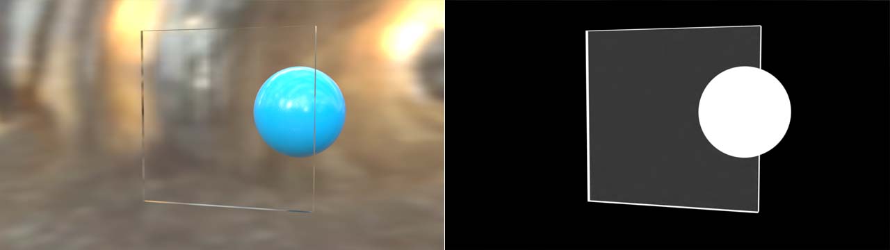 Alpha transmission is a good example for the negate operator. The following expression creates an alpha plane from transmissive objects. The syntax for this LPE is exactly the same as with the Transmission example in the previous chapter. The only difference is that the terminating event is not a light source, but the background B. So, you can write C<TG>*B.