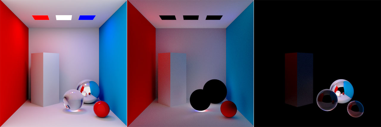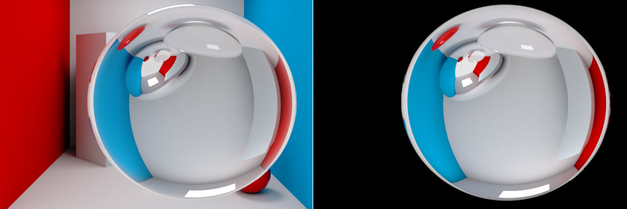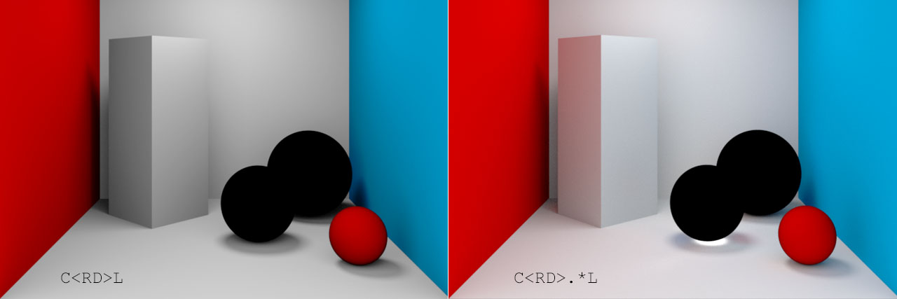 Let’s try a more sophisticated example. Imagine a glass sphere that occludes several objects and your LPE should detect only scene elements behind the sphere. The CTL expression will fail here, because the light path has to go through the glass surface at least twice to reach a light source. The current expression only has a single transmission event before reaching a light, which matches none of the existing light paths. To include paths that have arbitrary number of events, you need wildcards and quantifiers. The most obvious LPE is therefore C<TG>.*L. This will match any path that initially goes through glossy transmission, then goes through any number of events, and eventually reaches a light.