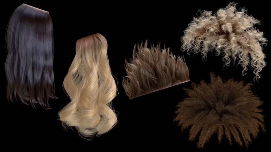 A selection of hair presets created by Andriy Bilichenko. Hair styles include straight, wavey, afro, curls and clumped. View full hair guides network to see how the hair was created, as well as their LOP nodes with material assignment that outputs to Karma render from STAGE context.