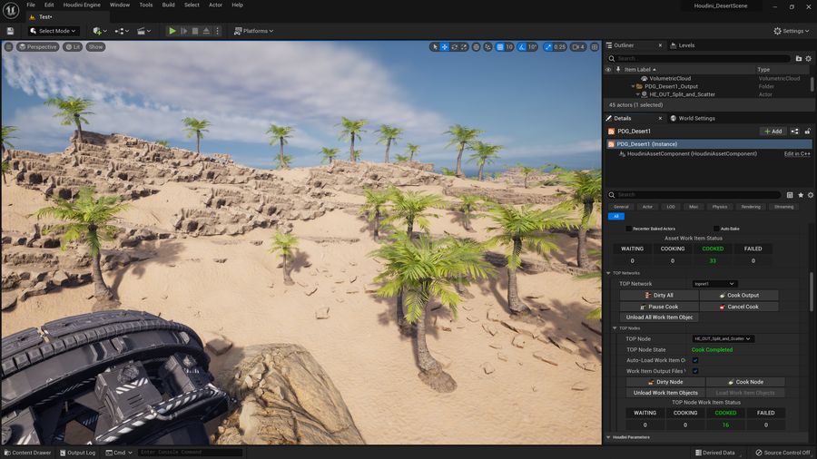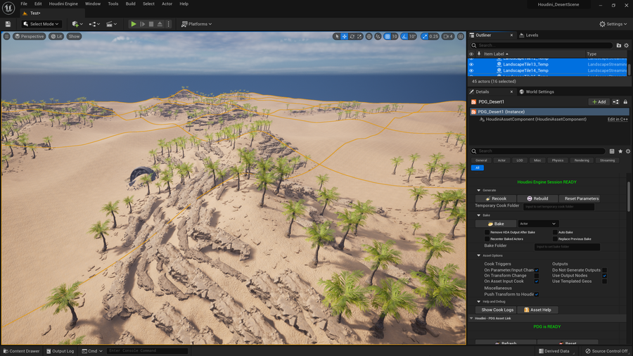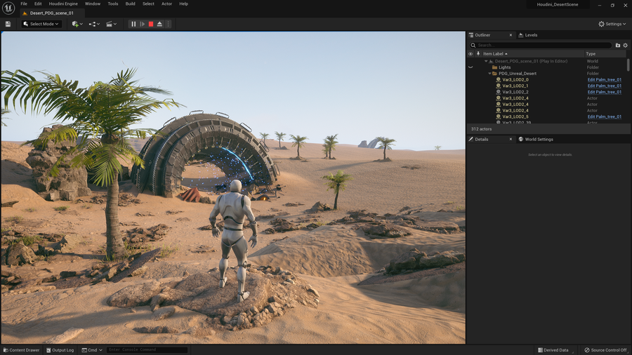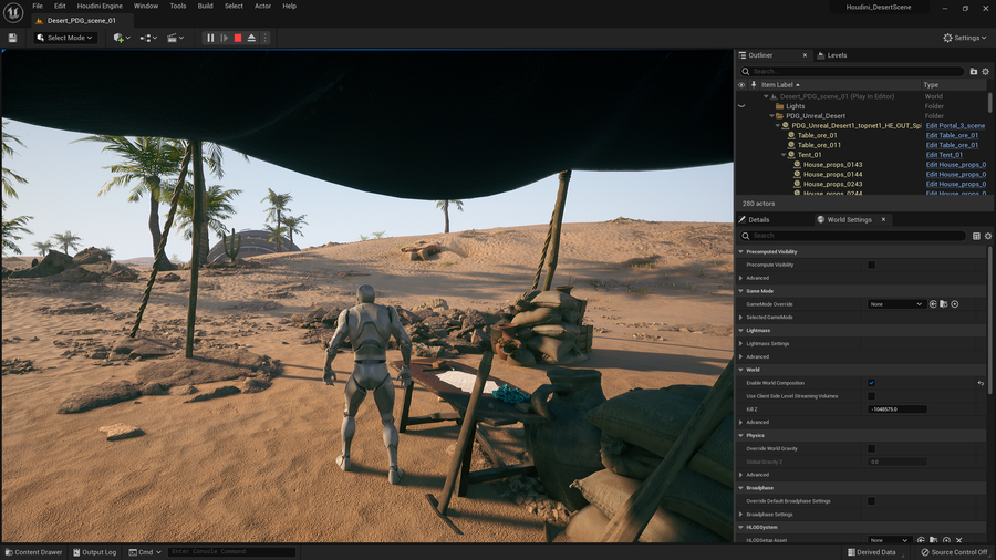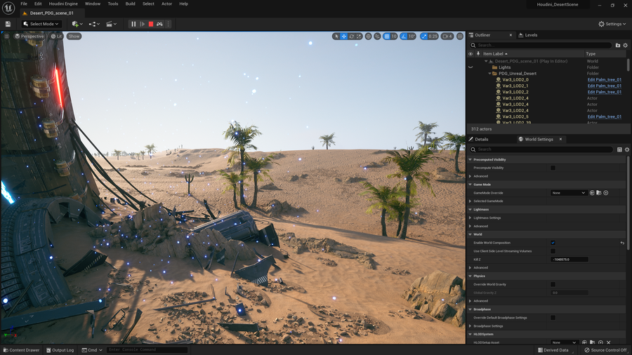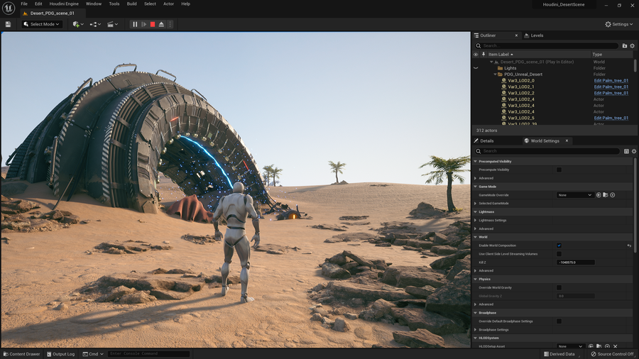 A large scale environment for games that consists of several key elements including the base terrain, scattered landscape features, foliage and man-made props. Explore how all of these elements were set up using procedural techniques. Starting with terrain, a layered desert landscape tool was created that can be opened up in UE5 using the Houdini Engine plugin.