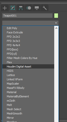 Select the object and open the 3ds Max "Modify" tab. From the modifier list, select "Houdini Digital Asset" and then you will be prompted to select the modifier that you want to use from a list of loaded assets. Highlight the asset you want to use and press "Select".