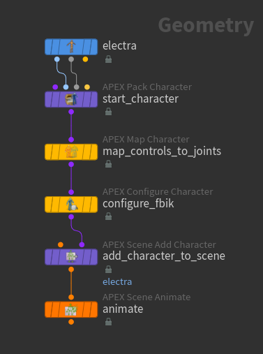 APEX Map Character SOP maps Electra’s rig controls to skeleton joints and creates a mapping property on the rig. This mapping property is used by the