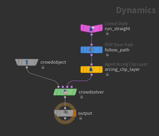 In the DOP simulation network, the agents are steered along the path using a POP Steer Path DOP, and the base animation clip is blended with the turning clips along the bend of the path by the
