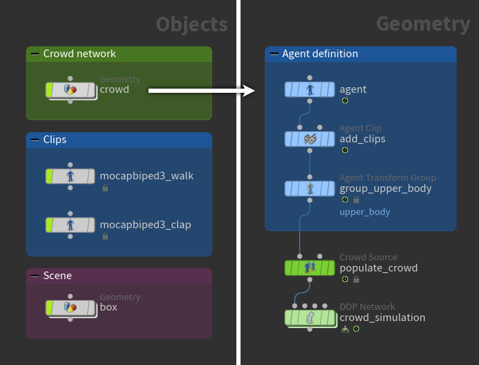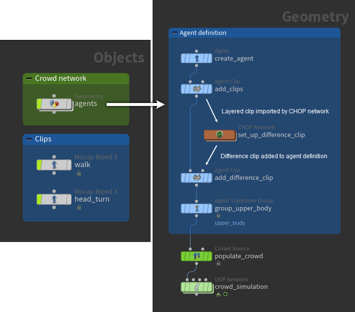 Define the available animation clips at the object level, and set up the crowd network at the geometry level (SOP network). The