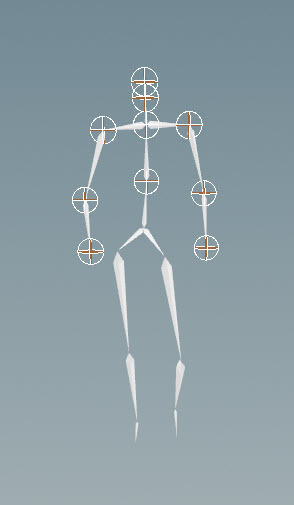 . To see the joints that are part of the group, turn on Show Guide Geometry, which displays spheres around the selected joints. Display the agent as Wireframe to more clearly see the guide geometry:Agent joints to layer the animation clip onto