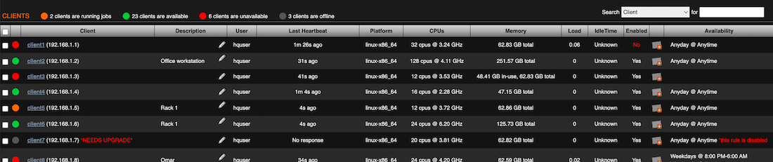 The dot color indicates the client’s status. Green – available Red – unavailable Orange – currently running jobs Dark grey – offline |
