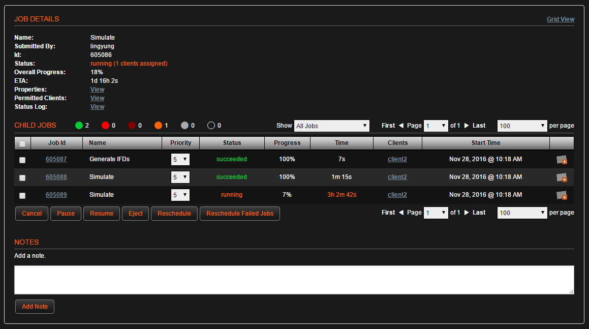When a job is paused, it is halted on the assigned client machine. The job remains in the scheduling queue where it waits for the user to either resume or cancel the job. Pausing a job also pauses its child jobs. To resume a job, turn on the checkbox next to the paused job and then click the Resume button below the Running Jobs table. |