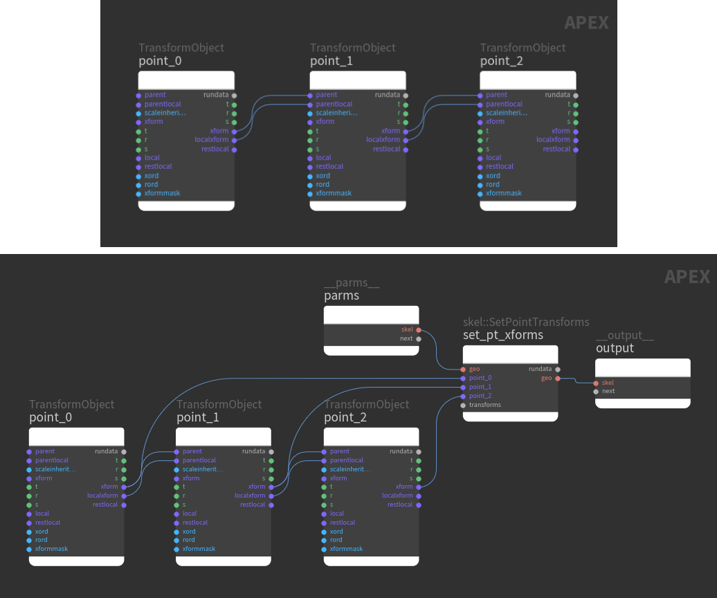 Selected TransformObject nodes (top); APEX graph after adding SetPointTransforms (bottom)