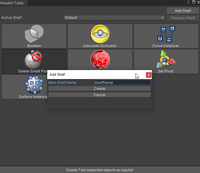 Tools are grouped in different shelves, that can be changed using the Active Shelf combobox. Clicking on the Add Shelf button will let you add more tool shelves, pointing to directories containing your own HDA that will be used to create Custom Houdini Tool.