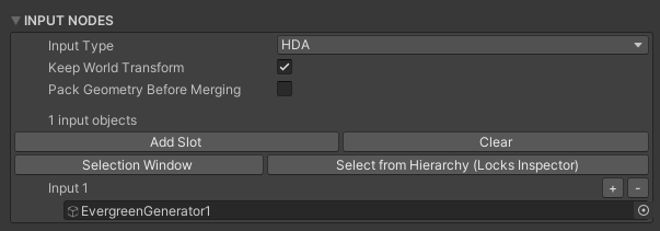 For HDA input type, this can be used to specify multiple HDAs in the Unity scene. Only the root GameObject of the HDA (the one with the Houdini Engine UI) is accepted here. When set, the plug-in will create a new Object Merge node in the Houdini Engine session, specify the path to the HDA in the "Object (objpath)" parameter, and connect the new Object Merge node to the current asset. This is more efficient than uploading the geometry created by one asset into another, since the connection is directly made in the Houdini Engine session.
