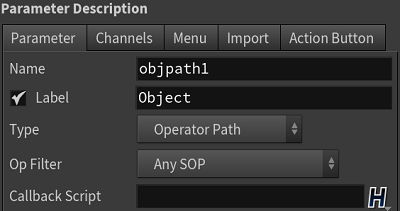 Object Path Inputs are created from Operator Path parameters that accepts a path to a Houdini node. In order to input geometry, the Op Filter needs to be set either to "Any Object" or "Any SOP". When geometry is assigned to this parameter, Houdini Engine will create the appropriate Houdini nodes that will represent the input geometry. The asset can then use these nodes to access the geometry.