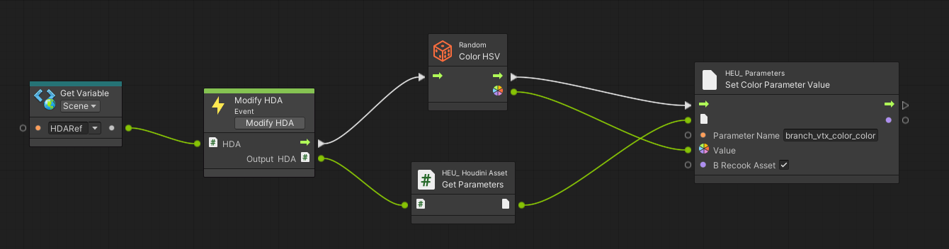 For example, here is an example of a graph that takes a EverGreen HDA, and then modifies the leaves to a random color.