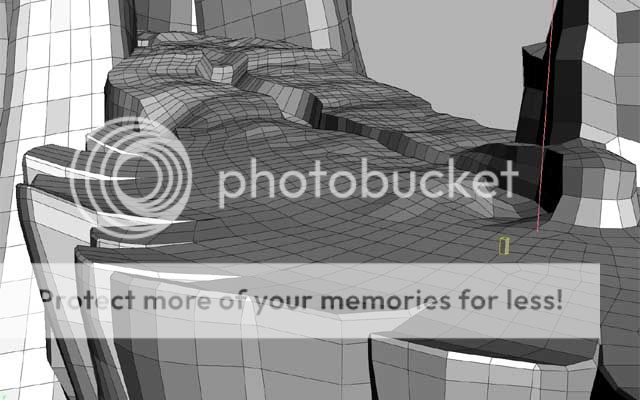 Antoine, the problem is that I plan to copy a lot of very small geometry (think small pebbles/stones) over a very large area, and I'm afraid that much of that geometry will end up below, or floating above the surface if the res is not high enough. Take a look at the pic, the little yellow box is supposed to be the scale of a human being, now imagine a small stone sitting next to it. Obviously the terrain would need to be subdivided A LOT more, otherwise any displacement map would alter the surface of the terrain too much for the pebbels/stones to appear where they're supposed to be.