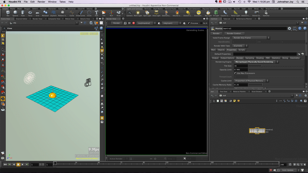 Any one out there using Houdini on a Mac having render problems. I am using Houdini Apprentice 13.0.582 on OS X 10.9.5 and when rendering the render view just says Generating Scene. This happens when rendering just grid, it just hangs at that point.