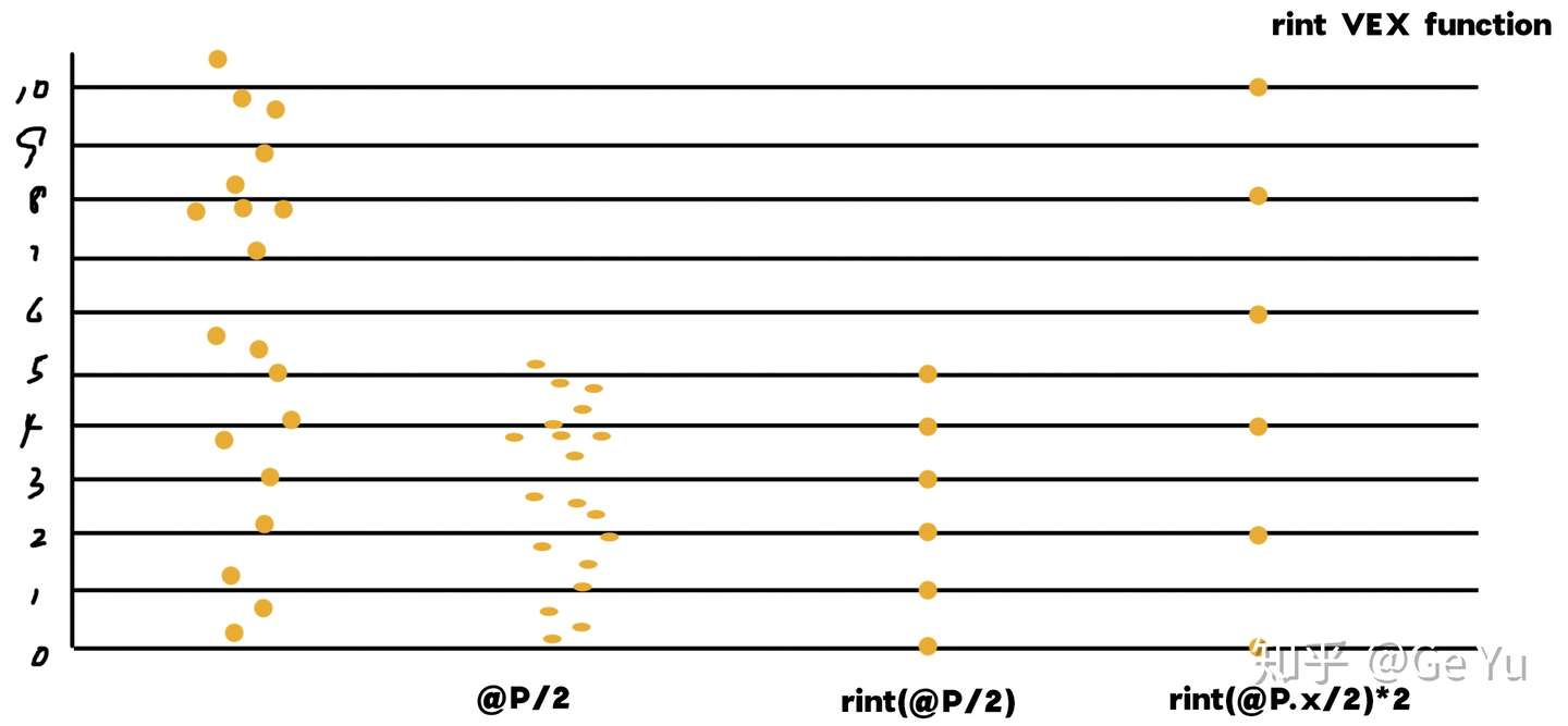 Note that the point cloud converted by the volume of the geometry is messy, and we only need to use integer points. In the fourth step, we use a Wrangle node to write a simple rint expression to deal with redundant points and only keep integer points.