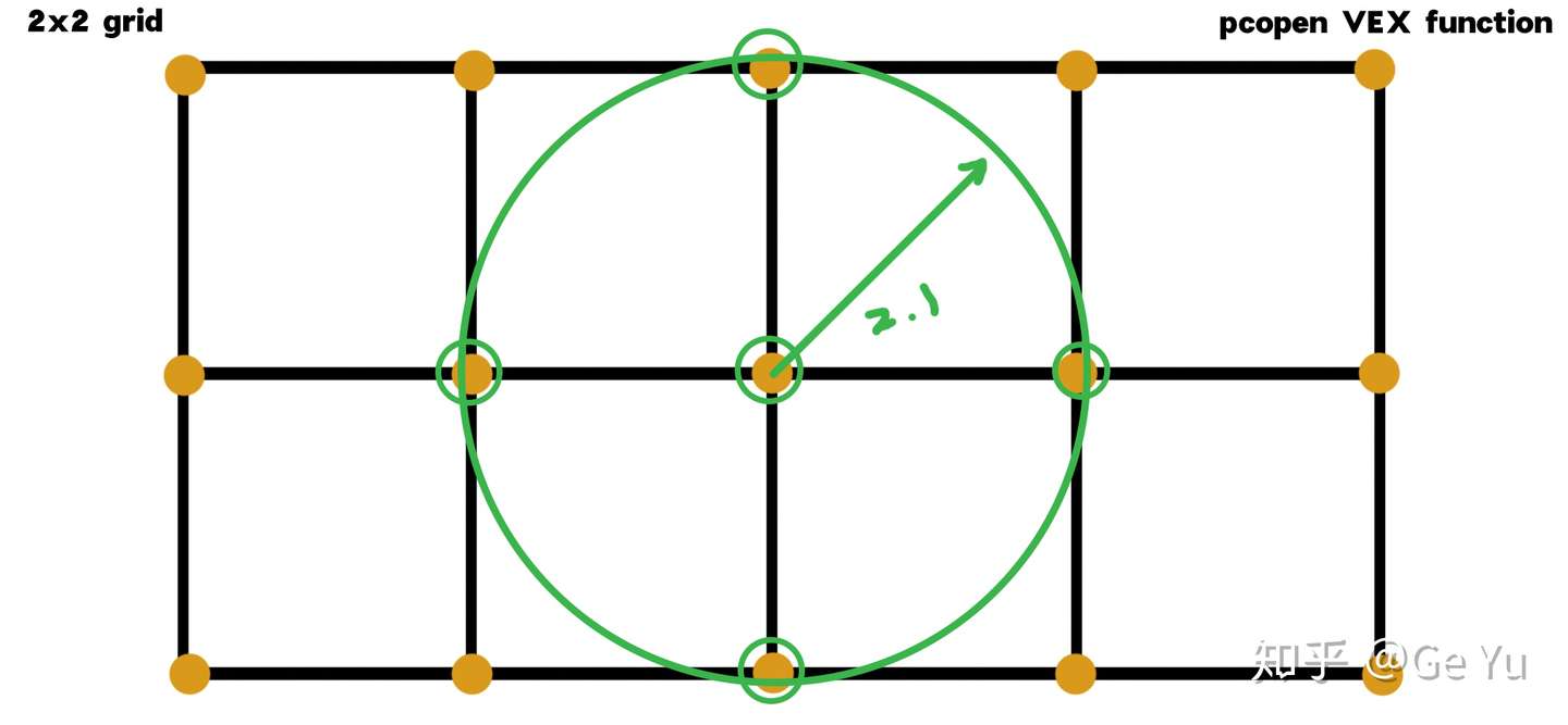 Here we use each point in turn to draw a circle with a radius slightly larger than the grid (2x2 grid) at the center of the circle, and each point covered by the circle will be found and returned. It can be clearly seen that the number of points on the edge line returned due to insufficient neighboring points is less than 5. The principle is as shown in the figure: