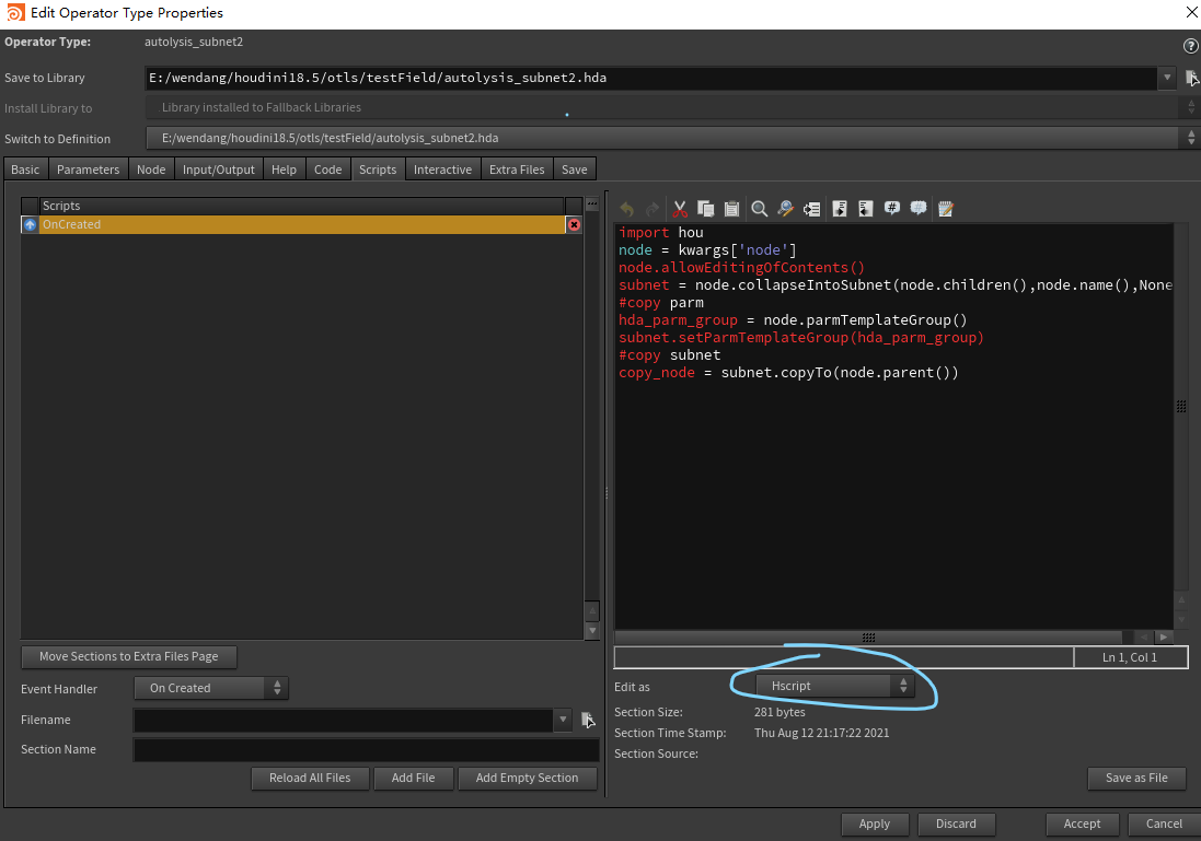 I want to write a python shelf tool, which add 'onCreate' section a python snippet to selected HDA node.