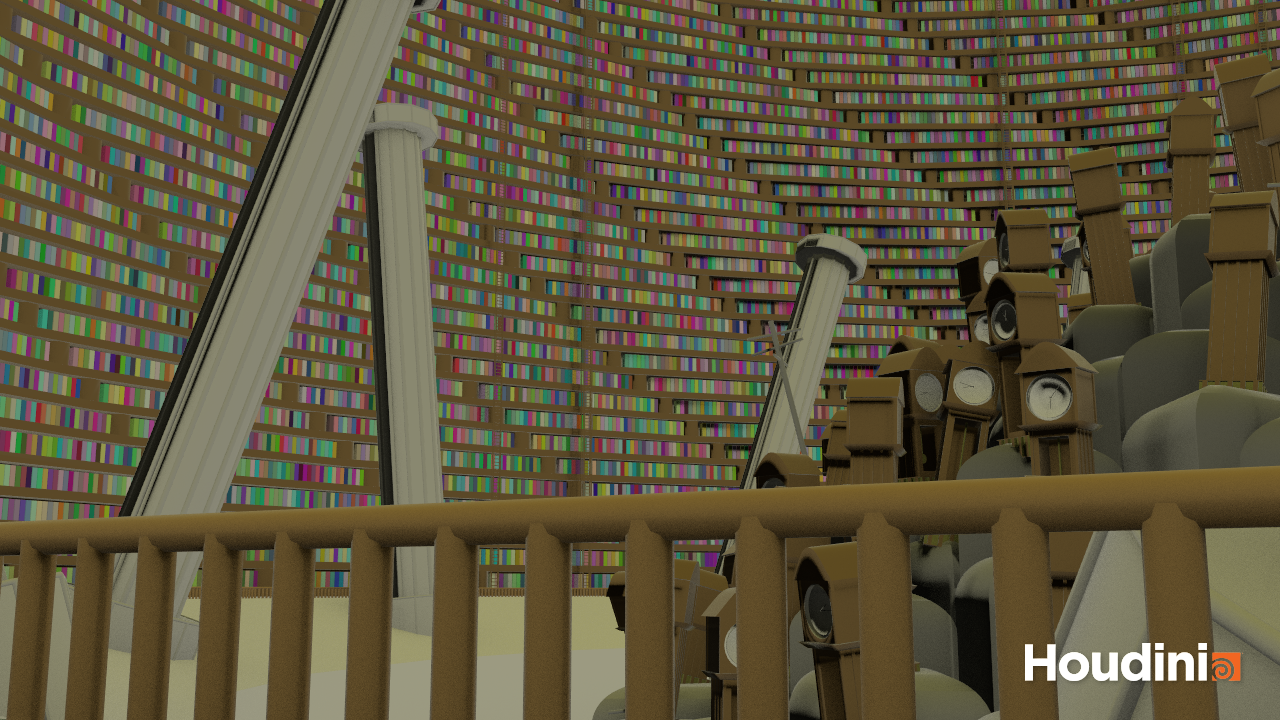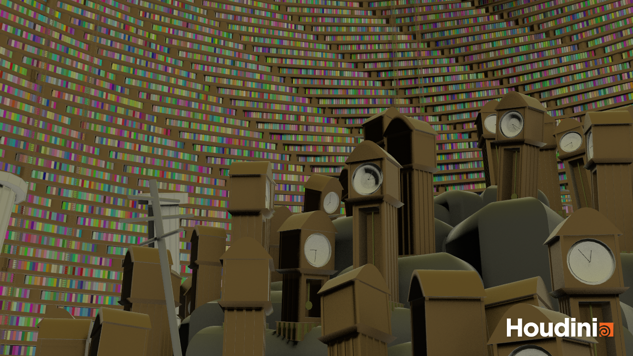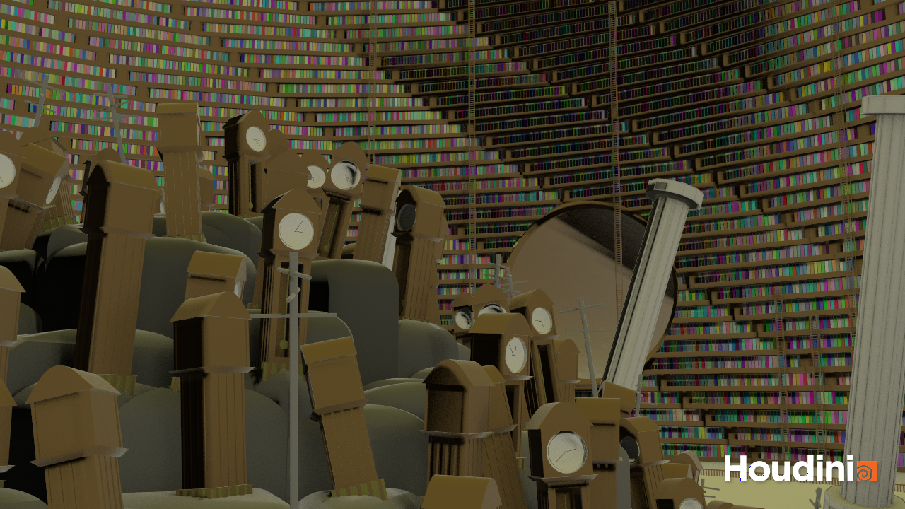 The Library of Time is a place from another dimension where the records of the past, present, and future events are kept secret. The library in the picture is massive, with the books being taller than the average human being. The grandfather clocks are also magnified. All of these are made using a combination of SOPs and VEX, with the key being scattering and attribute masks. All of the objects in the picture are made procedurally, and exclusively in Houdini. Images are rendered using Flipbook.
