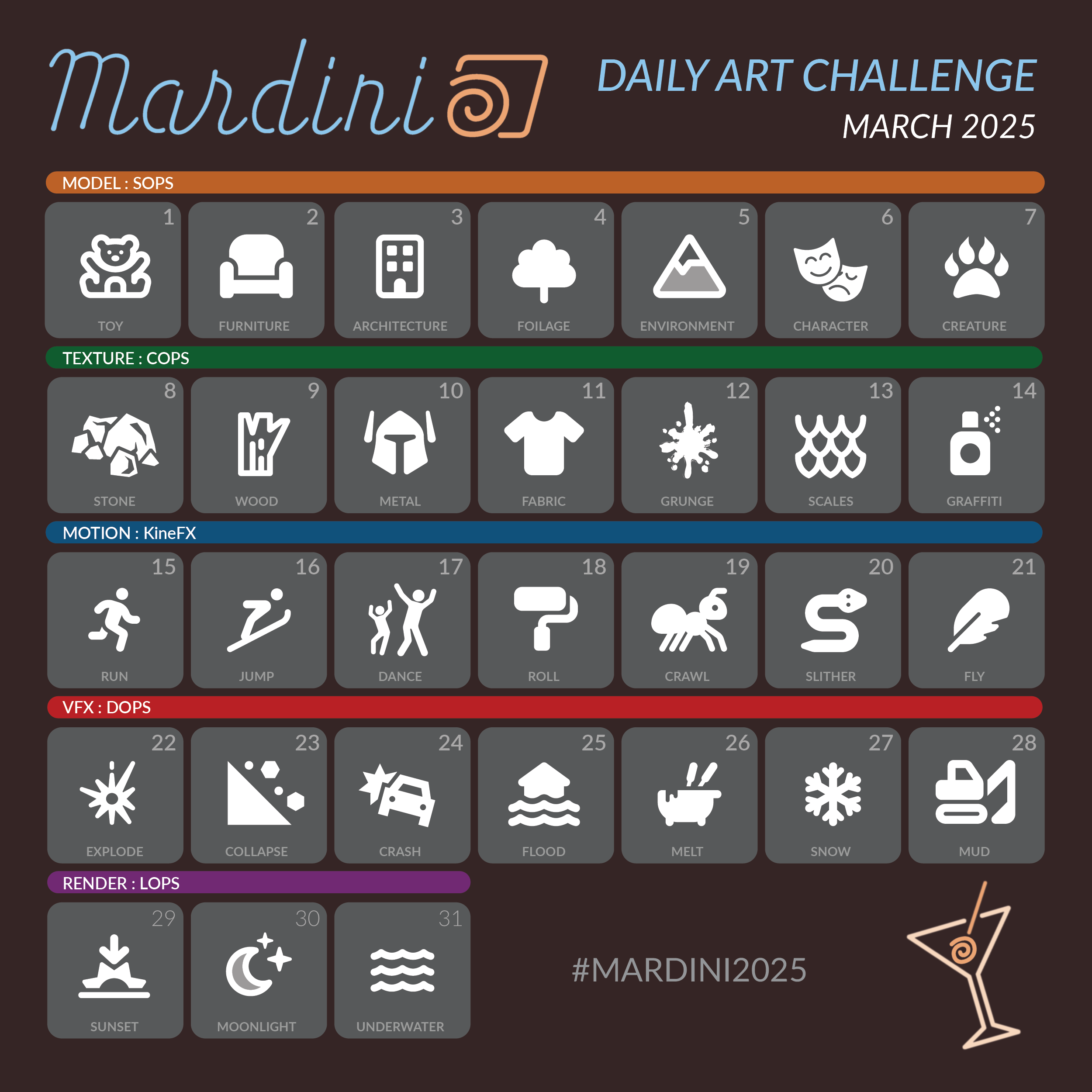 こちらが日々のお題です。応募作品には、その週の Houdini コンテキストを使用し、毎日のお題をインスピレーションにしてください。 今年の Mardini では、第1週はモデリング、第2週がテクスチャ生成、第3週にアニメーションし、第4週にシミュレーション、第5週にレンダリングするようにデザインされています。この通りに作業を継続する必要はありませんが、作業負荷軽減の戦略になることは間違いありません。