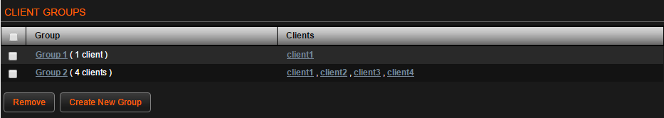 クライアントグループを選択することができます。 リストの下部にあるボタンを使って、選択したグループ(s)にアクションを適用することができます。 |