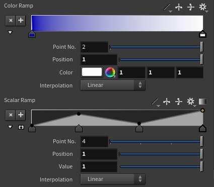 カラーと浮動小数点のランプパラメータタイプは、デジタルアセット定義を編集する時、または単一ノードのパラメータインターフェースを直接編集する時にRamp (Color)