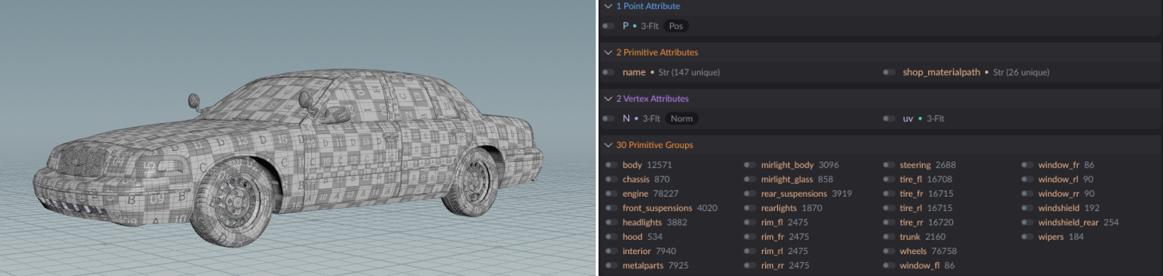 In this case, the car model already has proper groups and a name attribute. It's recommended to copy the name attribute and rename it to @path, which will be useful for applying textures later in Solaris. Fortunately, we also have an existing @shop_materialpath attribute that can be renamed to @path for the same purpose. Some additional steps include coloring parts of the wheels to better visualize their rotation and correcting the car body’s UV maps for use later during texturing in Copernicus. With that, we're ready to begin rigging.