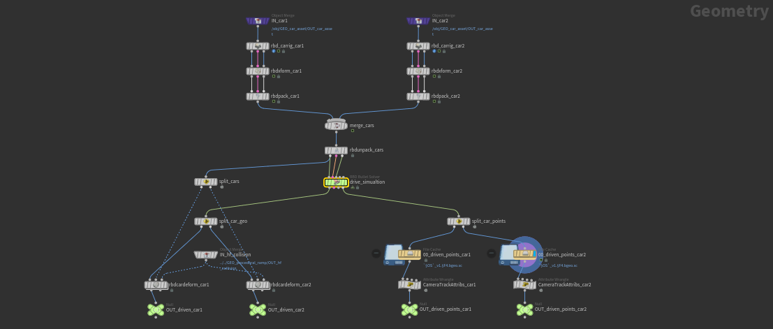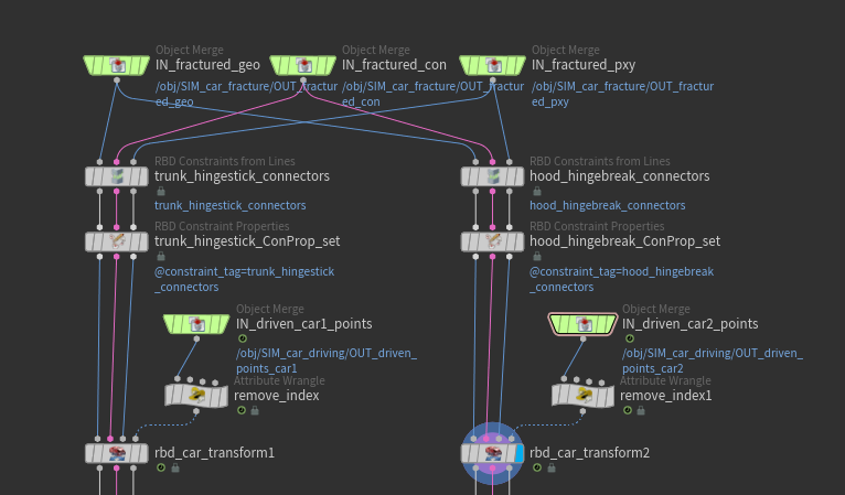 As mentioned earlier, the Car Fracture SOP allows you to build further on the existing setup. At this stage, we have one fractured car and two sets of car points with the @restxform attribute and drive simulation data. Using the new RBD Car Transform SOP, we can drive the fractured car using these simulation points, since the original body and wheel name attributes from the RBD Car Rig are still intact. Open the SIM_car_crash geometry node to follow along.