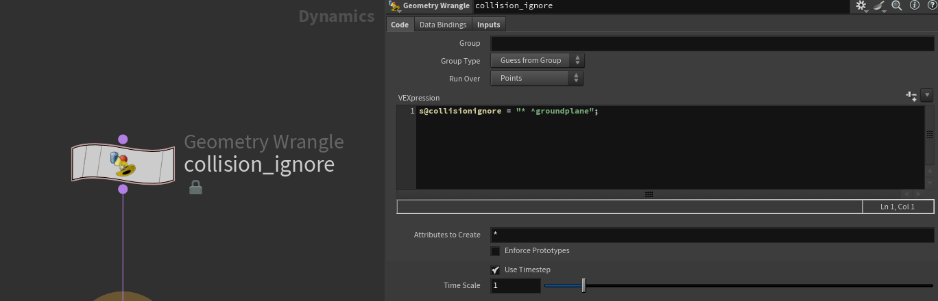 Geometry Wrangle used within the Bullet Solver to ignore collision between cars.