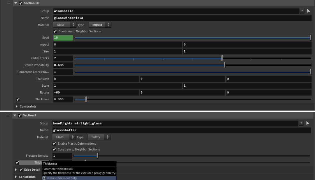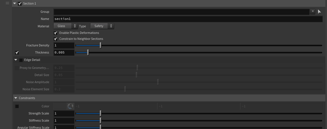 Next, the process becomes straightforward in the Sections tab. You can assign different parts of the car to separate sections for independent control over the fracture type (metal, glass, wood, rubber). Aside from adding Edge Detail, Proxy to Geometry can be enabled for an additional fracturing layer with varied fragment sizes. Constraint attributes like Strength Scale, Stiffness Scale, and Angular Stiffness Scale can also be adjusted per section.