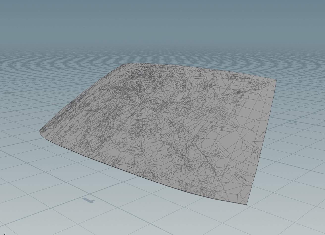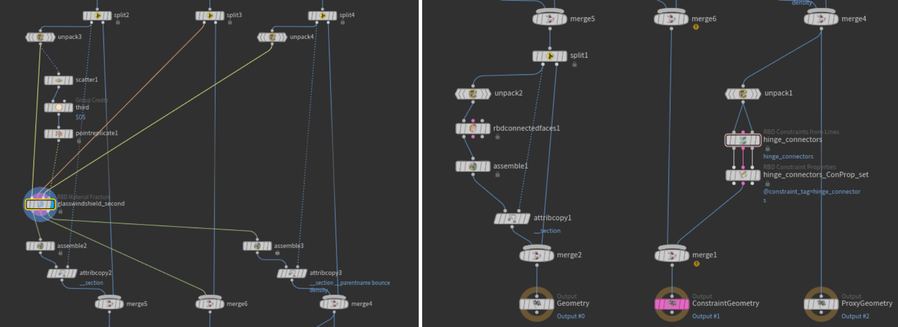 For the glass, we apply the Safety model to all windows except the windshield, which uses the Impact model. This is a creative choice allowing the windshield to crack in a concentric pattern. The Safety model also has plastic deformations enabled, while the Impact model requires more manual setup—since it only includes glue constraints by default. This would cause the glass to break immediately, but we want it to bend slightly first to reveal the concentric crack pattern. To achieve this, we override the constraints using an RBD Constraints Properties SOP to switch from glue to soft constraints—either right after the fracture node, within it, or later in the network before simulation, as done in this project.