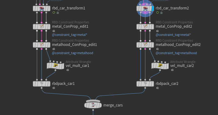 You can also perform other car-specific operations, such as editing constraint properties on individual sections before packing and merging. In this example, overall metal constraint strength has been tweaked independently to make one car more rigid than the other. Even velocity manipulation is possible using a simple VEX expression: v@v *= chf("Multiplier");
