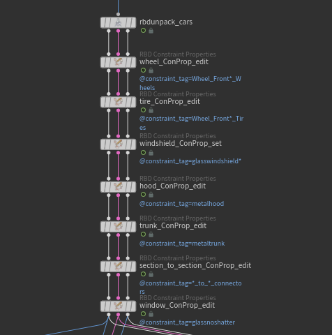 Most of the key work happens under the Constraints tab on the RBD Bullet Solver. Here, constraint groups are selected using the @constraint_tag attribute and deleted either based on a threshold or at a specific frame. This gives you fine control over how the cars break apart, allowing for more art-directed destruction.
