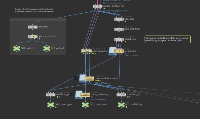 Right before simulation, the cars are split and frozen at frame 1 using a Timeshift SOP. These are later used in the RBD Car Deform as reference inputs for deformation.