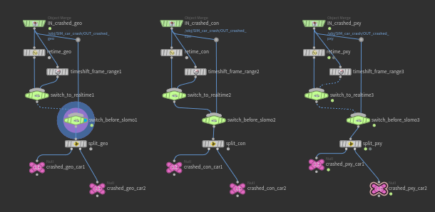 After addressing this, the next step is to clean up any unnecessary attributes and groups, and compute velocity on the deformed geometry. Since we use the fractured version of the cars only from the frame of impact onward, we can blend it with the non-fractured car from the drive simulation up until that point.