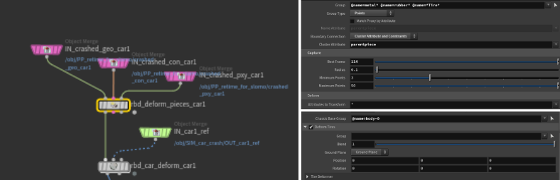 The RBD Deform Pieces SOP requires three inputs: geometry, constraints, and proxy geometry. The group must be set using the name attributes created during the fracturing stage. Since we only need to deform metals and rubbers, it's best to name the parts accordingly (e.g., metalxyz, rubberabc, etc.). Set the Group Type to Points, and the Boundary Connection to Cluster Attribute and Constraints. This ensures that pieces with deleted constraints don’t remain deformed but instead break apart correctly. Set the Cluster Attribute to @parentpiece. Finally, for the RBD Car Deform SOP, use the reference geometry output from just before the crash simulation as the second input.