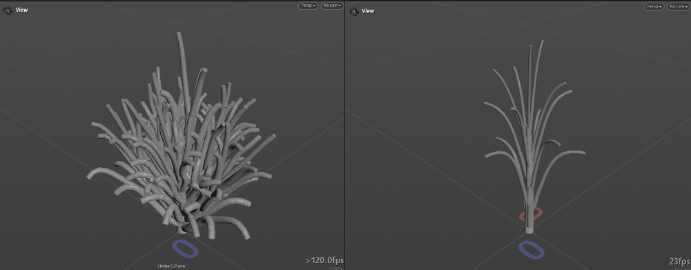 For the actual sim I’m using proxy geo. I just ran in a convex hull for each of the objects, I’m using simple for each point loop because I’ve packed geometry beforehand with Merge Packed. After some remeshing on top, it’s time to sim. For the simulation, there is nothing fancy. I used Vellum Hair preset and simply changed Mass and Thickness to Calculate Uniform. After that, I’m running a point deform node that uses the original plant geo and runs its movement by the convexhull simulation. Here is the result:
