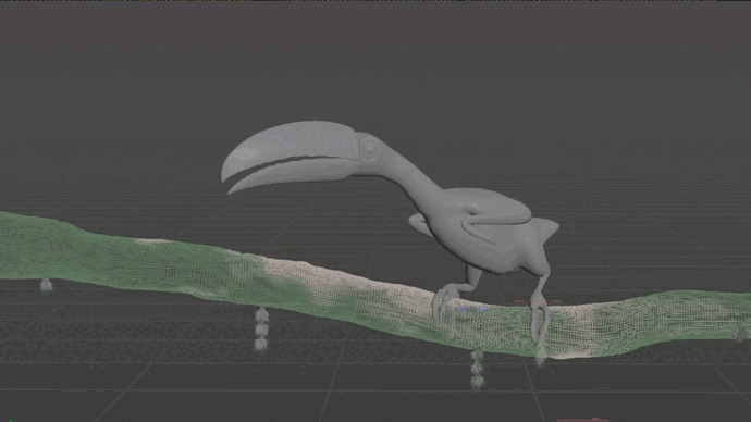 For the groom cache and skin cache, I’m using a blend shape node to drive the lower part of the groom and feet to match the movement of the branch. I just create a mask attribute and copy to points both skin and groom, and then blend shaping in between. Here you can see the difference between adjusted feet and the default cache: