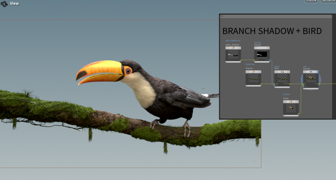 For the toucan, I configured two scenarios; one when the birds just come through to the render node and another in which I disable primary rays for it. It will still create shadows: